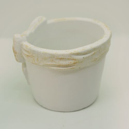 リボンプランター(底穴あり) 可愛らしいリボンデザインが特徴のリボンプランターです。 サイズ・容量:巾13×奥行13×高さ10.5cm 内寸:φ10.5×高さ8cm 素材・成分:セメント ・注意事項・ 色の見え方にはモニターによって差があります。固体差がありますので、あらかじめご了承ください。また、手作り感により、細かな傷やムラがある場合がございますが、味わいとしてお楽しみください。実店舗での販売も行っておりますので、在庫状況はタイミングによって異なる場合がございます。