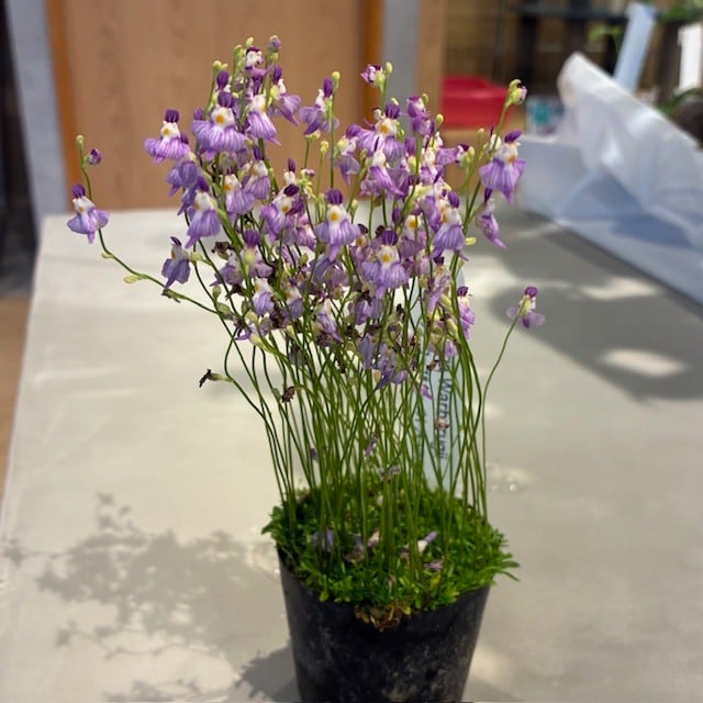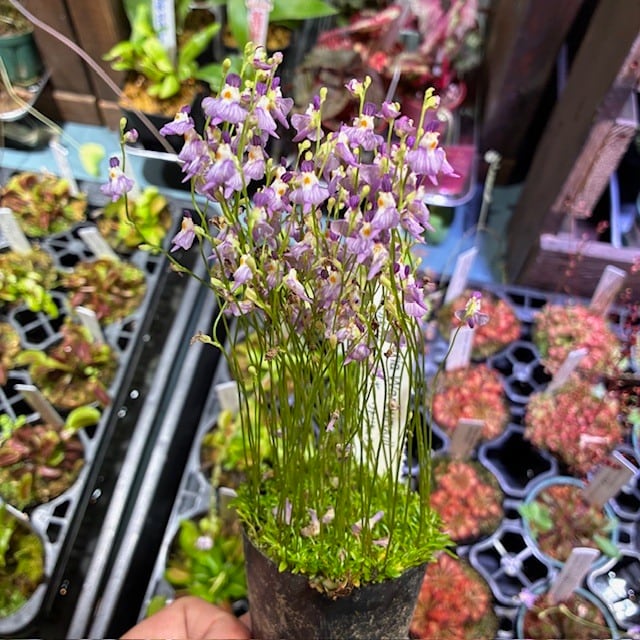 通称クリオネゴケ。現在満開です!湿地に生息する食虫植物、ウトリクラリア・ワープルギーのポットになります。水中に展開した捕食嚢で微生物などを食べます。(特に餌は与えなくても大丈夫です。)6cmのポットにピートで植え付け、1cmほどの腰水で育成しています。花は輸送中に落ちることもありますのでご了承ください。