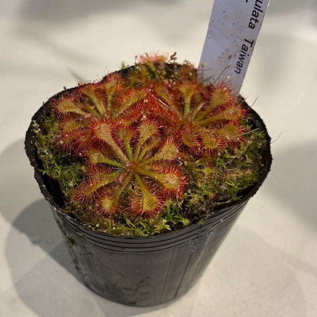 台湾原産のコモウセンゴケ。葉には粘着質な液体を出す毛がついていて、虫を捕らえて消化します。強光下ではより赤くなります。5月頃からピンク色の花を咲かせ、種で増える他株分けでも増やせます。